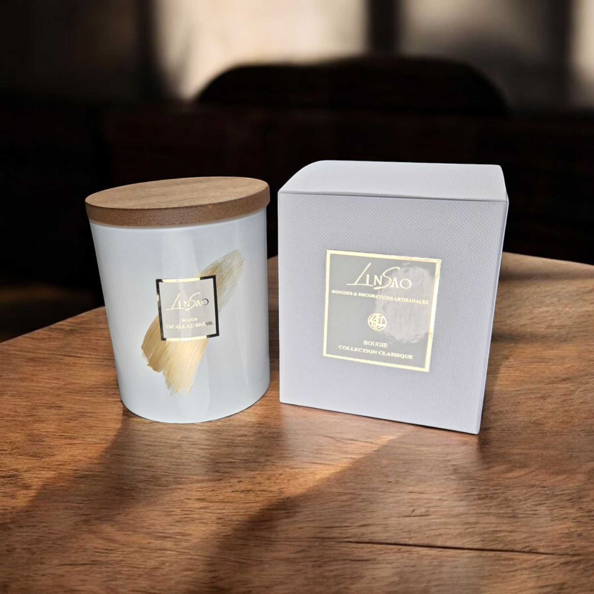 Son contenant en verre laqué blanc, orné d'un délicat design fait à la main en couleur or, apporte une touche de sophistication à votre intérieur. Le couvercle en bois ajoute une note naturelle et chaleureuse, tout en préservant la fragrance lorsque la bougie n'est pas utilisée.