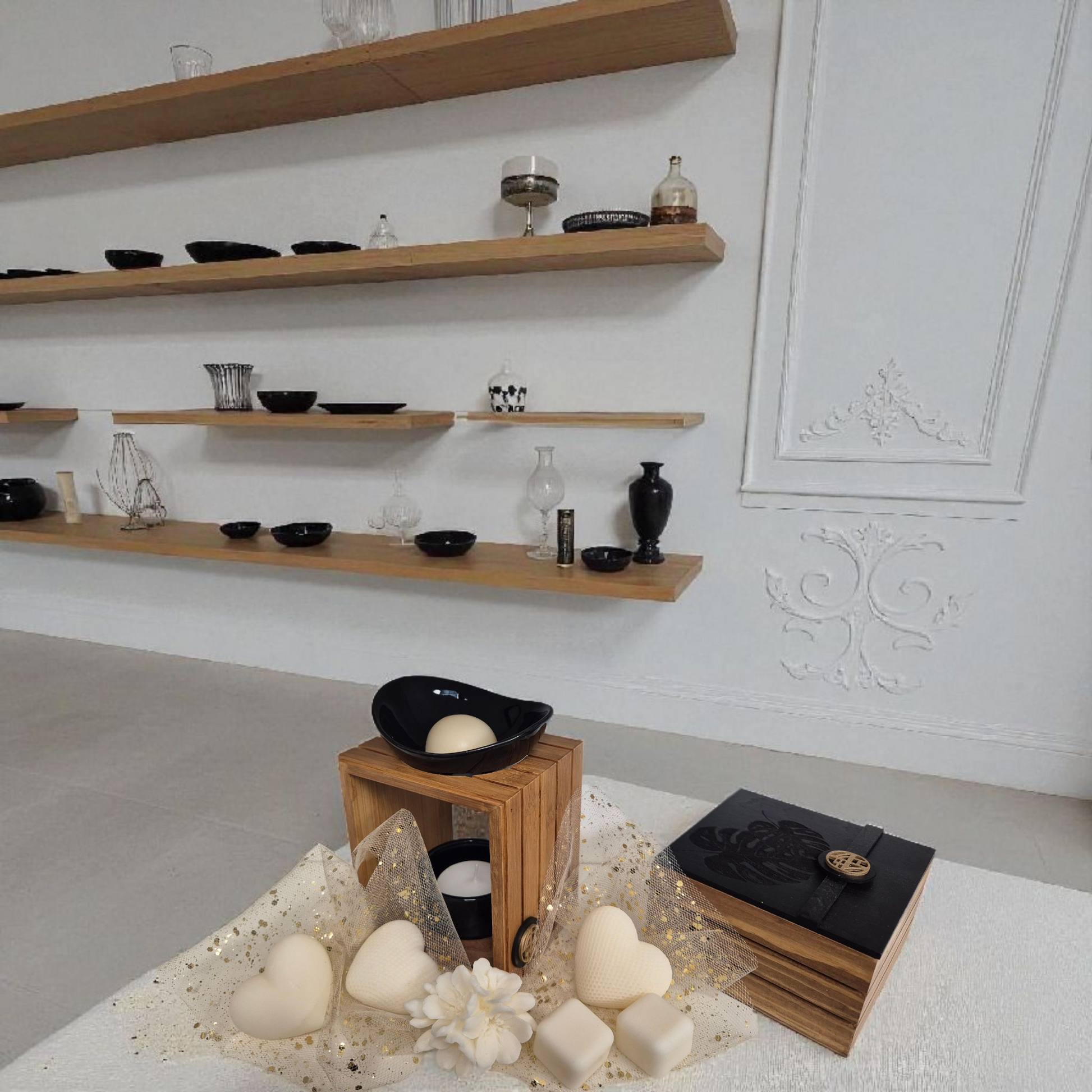 Coffret Brûleur à Fondants Parfumés & Boîte à Fondants Gravée (noir)