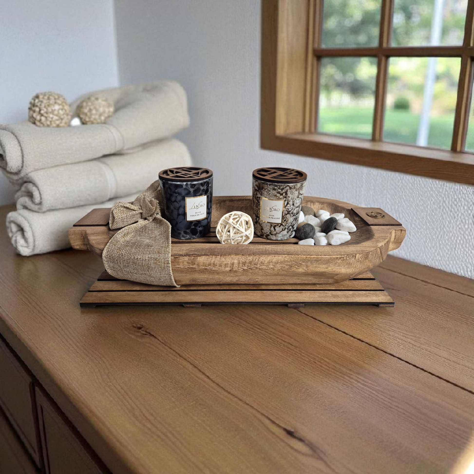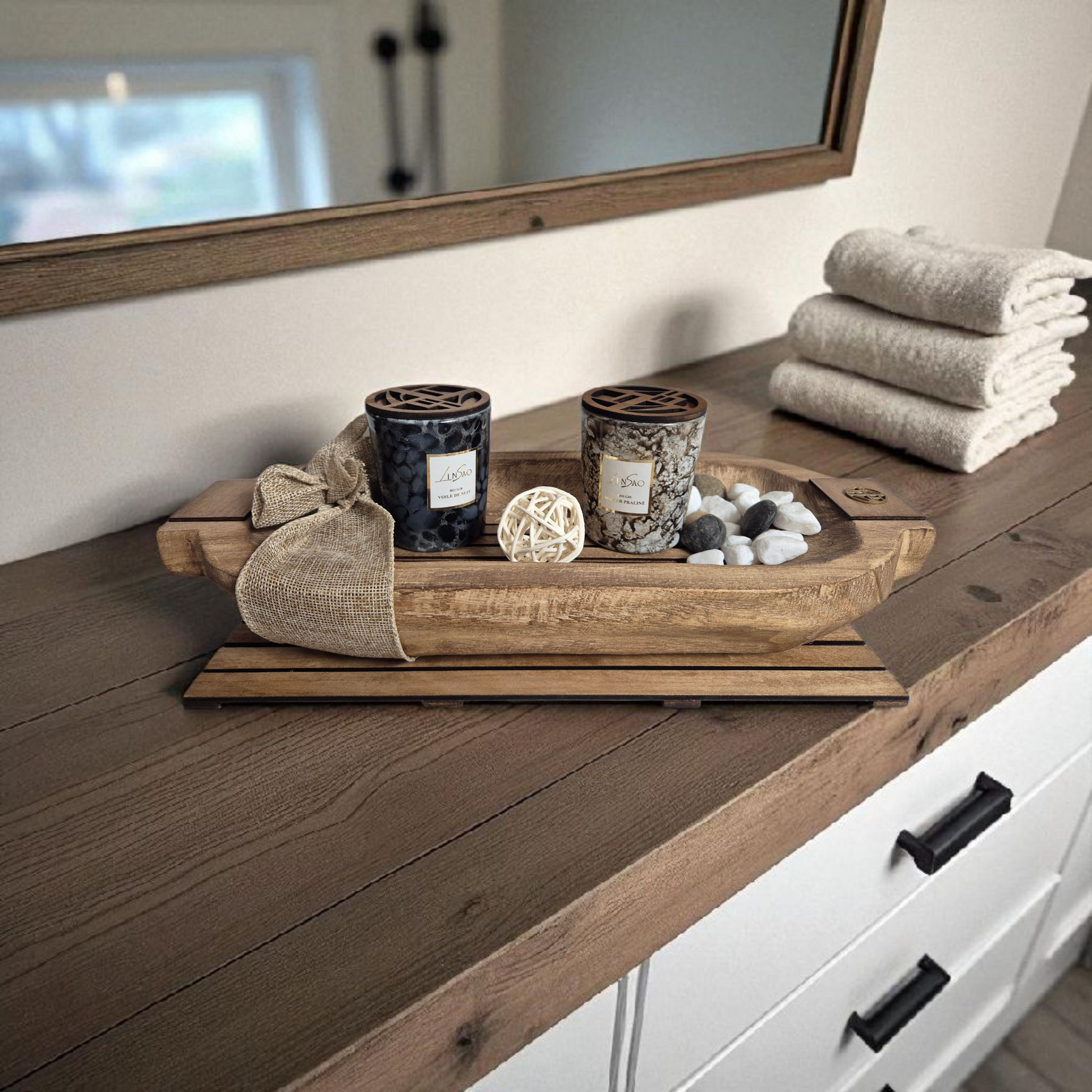 - Barque en bois et 2 bougies + Couvercle (entièrement fait main)