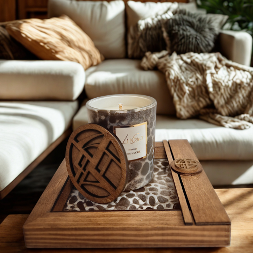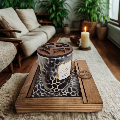 🕯️ Mini bougie “Bois Sacré” – parfum Bois de Oud & plateau en bois peint à la main