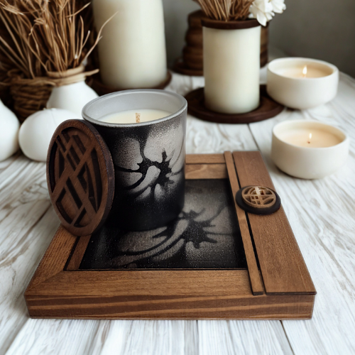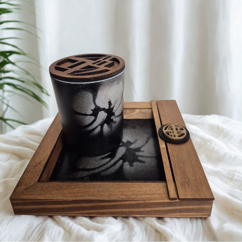 Elle est accompagnée de son plateau assorti en bois, minutieusement peint à la main, ce qui en fait une pièce unique. Ce support artisanal apporte une touche naturelle et élégante, sublimant la bougie et créant une atmosphère apaisante et harmonieuse.